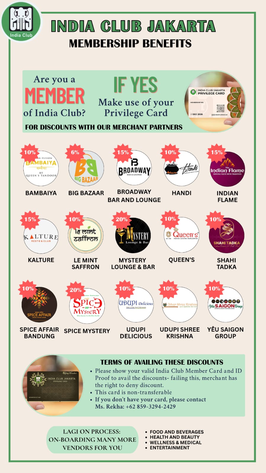 Exclusive Discount & Privileges in several renowned restaurants / Indian Grocery Stores / Hospitals / Merchants.